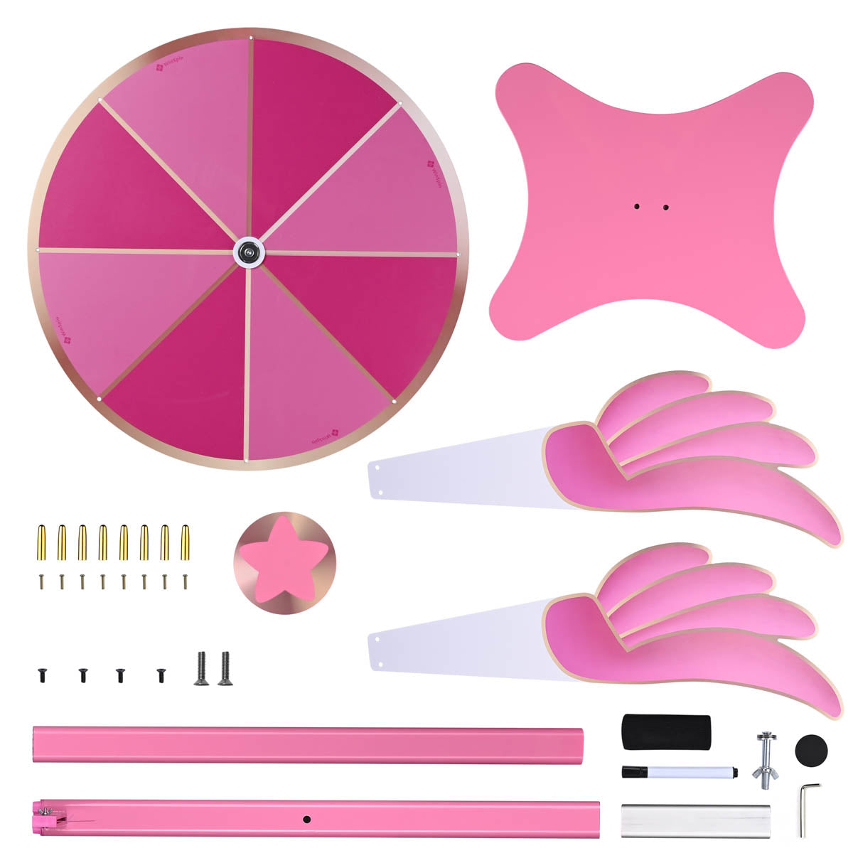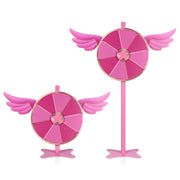 Add a touch of whimsy to any event with the WinSpin 24" Pink Prize Wheel. Its all-pink exterior design, complete with lovely wings, makes it a standout addition to parties, weddings, carnivals, and beauty malls. The removable poles allow for versatile use as a tabletop or floor stand, while the petal-shaped base ensures stability. Let the fun begin!