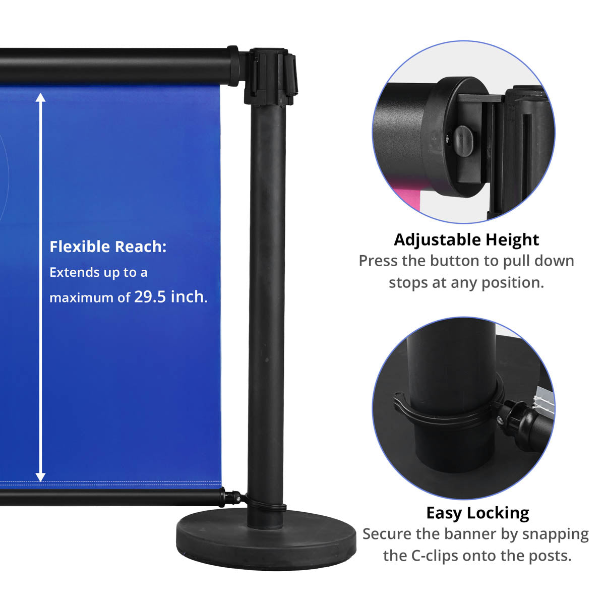 - Quick & Tool-Free Assembly - Simply attach your custom banner, pull down the crossbar, and adjust the posts to your desired spacing. Achieve a polished, professional setup in seconds, saving you time and labor