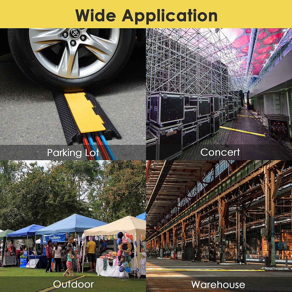 Heavy-duty 2-channel cable protector ramp perfectly sized for 1.2-inch cables, hoses, or cords. Organizing and protecting multiple lines simultaneously. Eliminates parallel runs of multiple single ramps, saving space and installation time. Creates a neat, professional cable corridor.22,000 lbs capacity, high-vis lid & anti-slip surface. Ideal as a driveway hose protector or floor cable cover for warehouses, events, and job sites.
