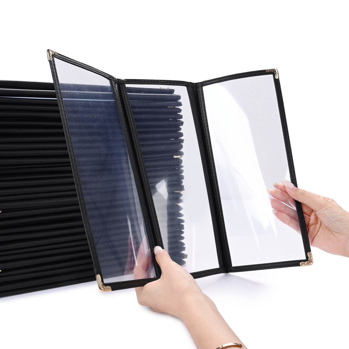 - Menu holder with a soft touch and the corners are finished in elegant gold-colored metal for a classy appearance