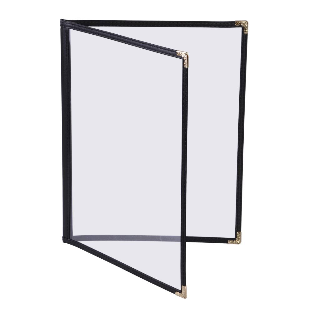 The Display Outlet 11"x8 1/2" Clear Menu Cover features Booklet-style, Tri-fold, and Panel designs, offering multiple page layouts and viewing styles to suit different menu needs. Compatible with standard letter-sized menus, these durable covers are ideal for displaying daily specials, drink selections, or dessert options. Perfect for restaurants, hotels, bars, cafes, kitchens, and wedding venues.