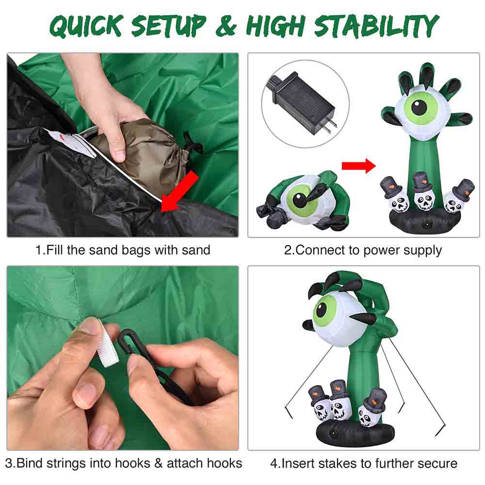Giant Inflatable Monster Hand with Eyeball self inflates in minutes to create a giant prop. It features horrible sounds activated by moving motions to freak your friends out. Built-in color-changing LED lights illuminate the prop for decoration, providing a unique night viewing experience for your family and neighbors.