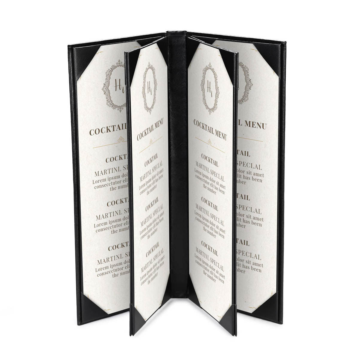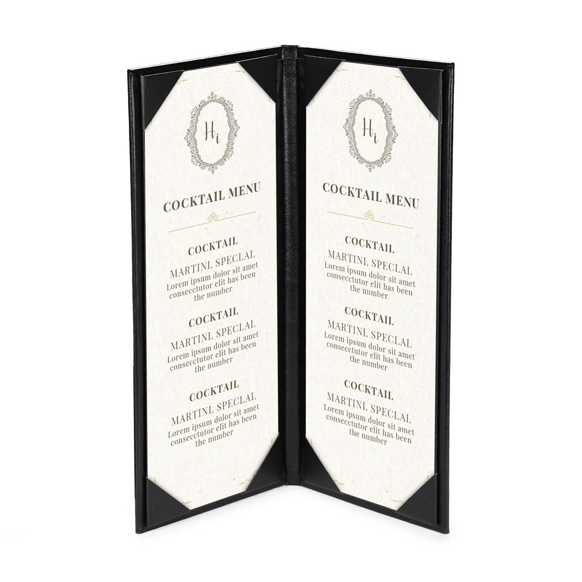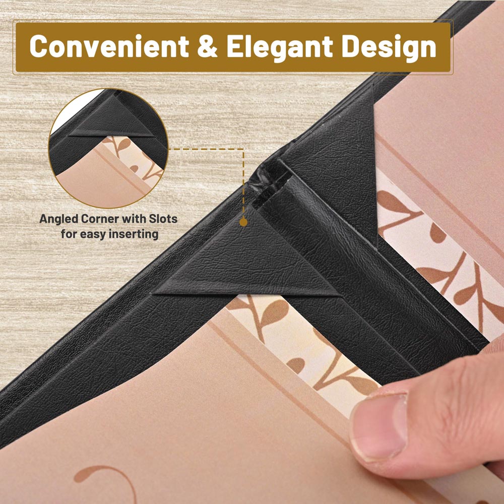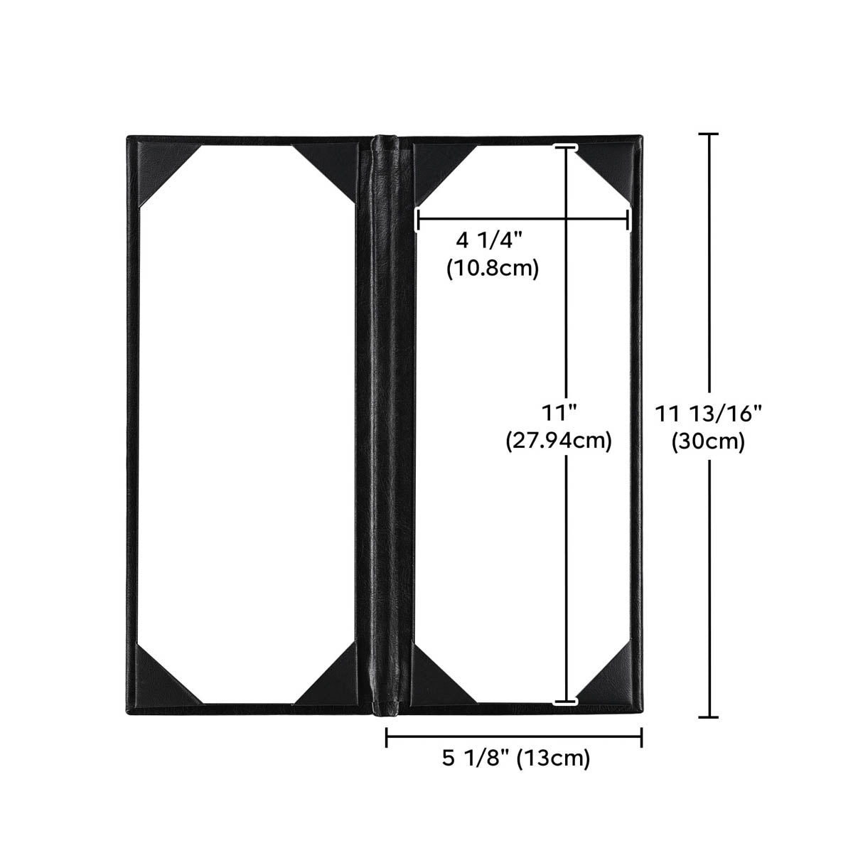 - 4 angled corners on each panel with slots for easy inserting the menu sheet and fixing it firmly