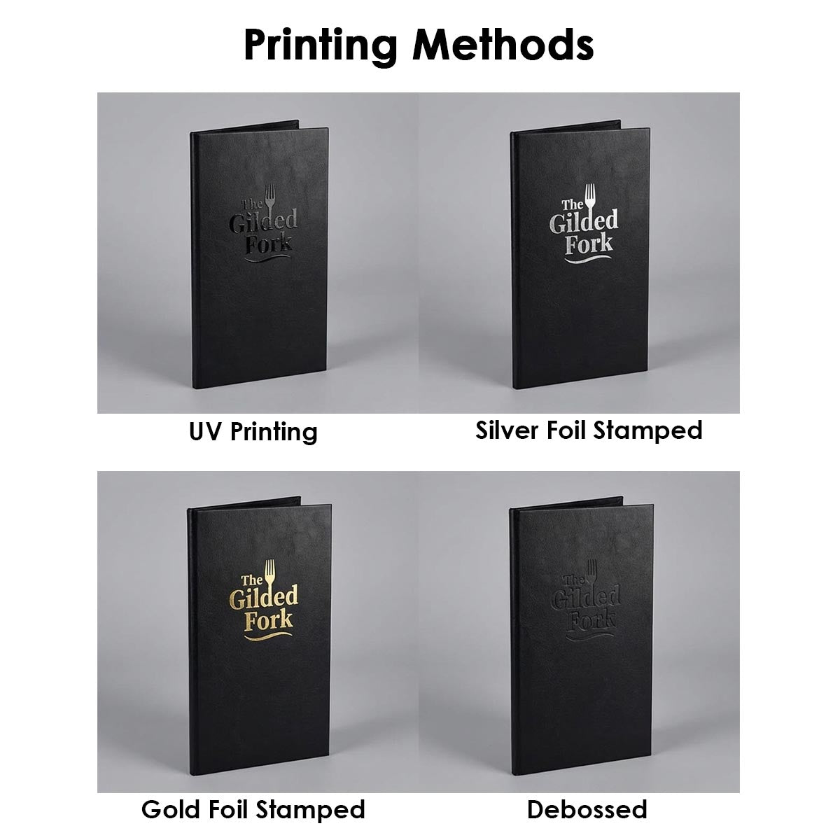 Get your logo on your menu covers! TheDisplayOutlet offers Custom logo customization for your menu covers. Pricing includes DHL shipping and the cost of your custom logo, with a minimum order 30ct. We specialize in: UV Printing, Embossing, Foil Stamping.