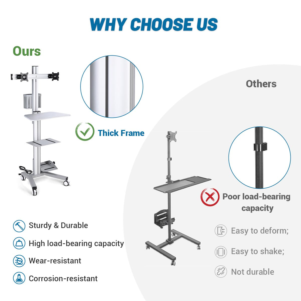 Purchasing and using computer cart on wheels will make your office life more concise and exciting. The mounting bracket for dual Monitors can adjust the angle of the display screen, and includes a tray to hold your label printer. Also, the computer cart can be adjusted in height, allowing you to stand and work comfortably under sitting conditions.