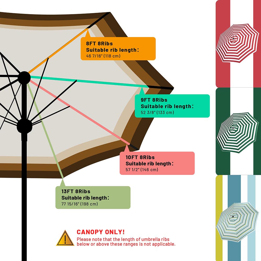- 9ft Universal Replacement umbrella canopy, fits for 9ft 8-rib central pole umbrella with long rib length range from 4 5/12 ft to 4 1/2 ft, provides shade for your patio, garden, pool deck, etc