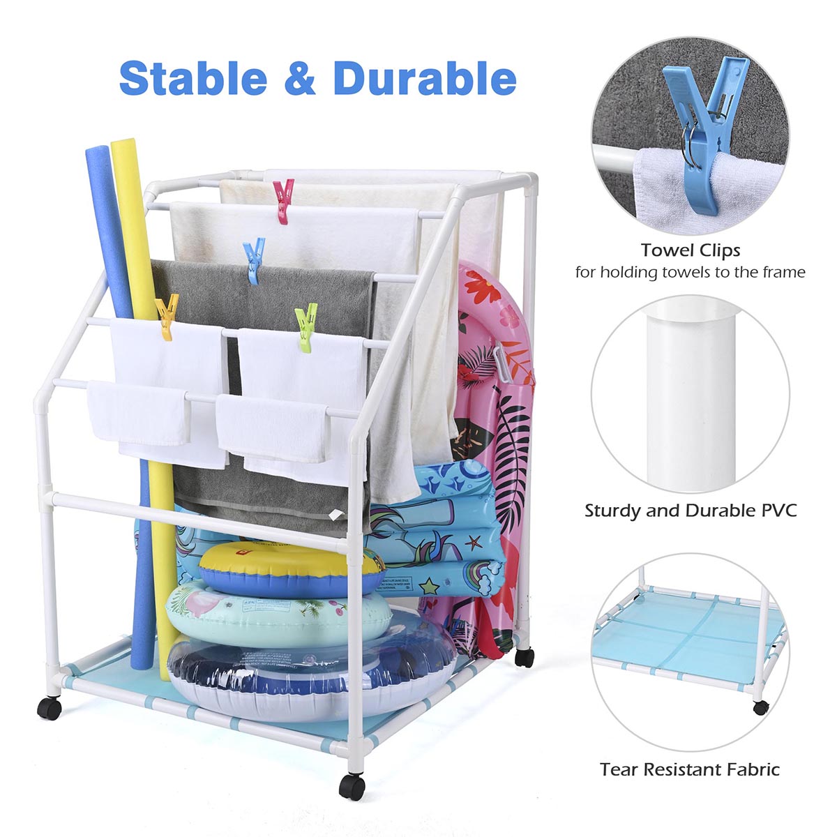 - Perfect organizer for facial towel, bath towels, kickboards, swimming rings, pool floats, paddles, pool noodles