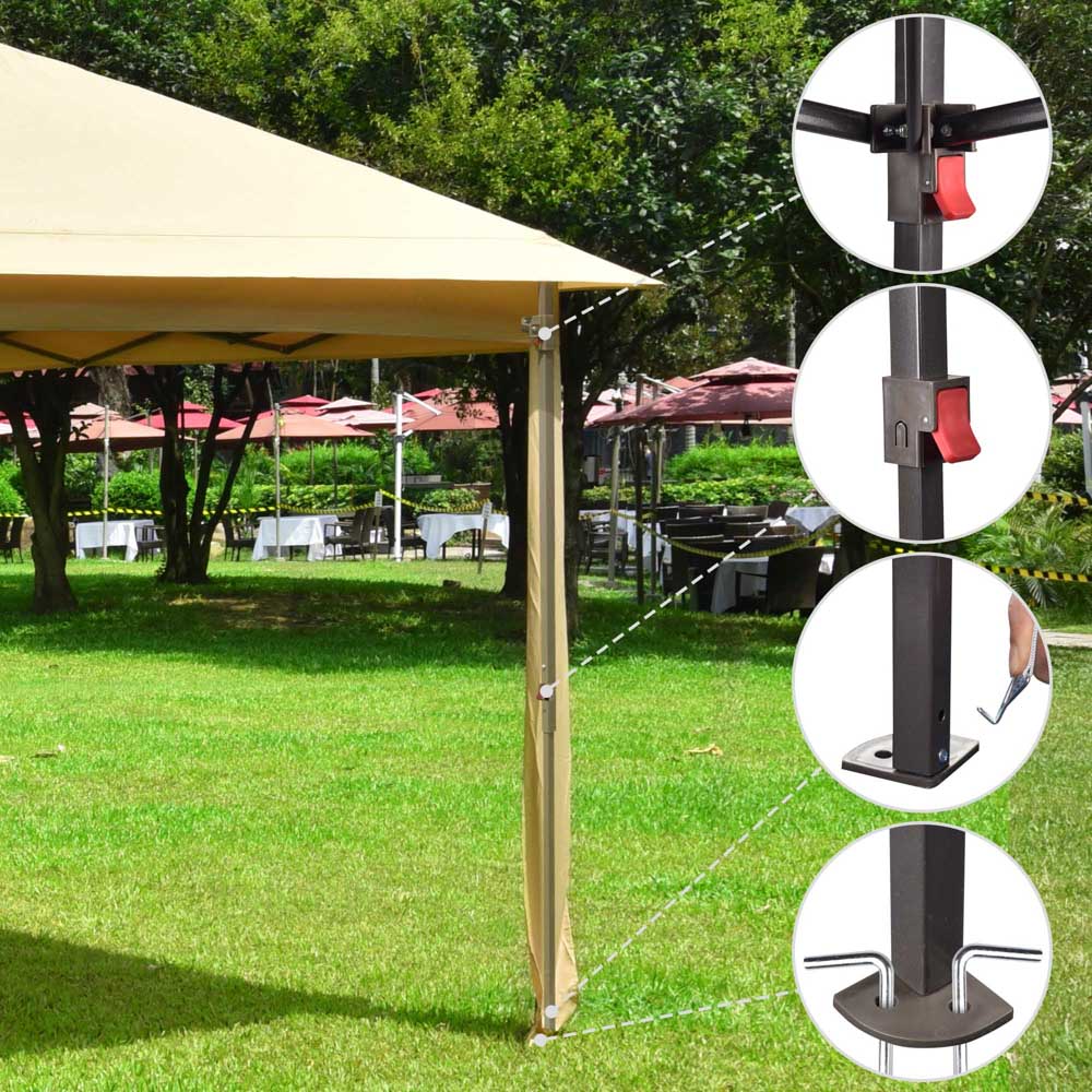 - Mesh sidewalls with zippers can be collected while not using. - Tool-free assembly with 4 steps: Extend the frame, fixate the canopy, adjust the height and then attach sidewalls