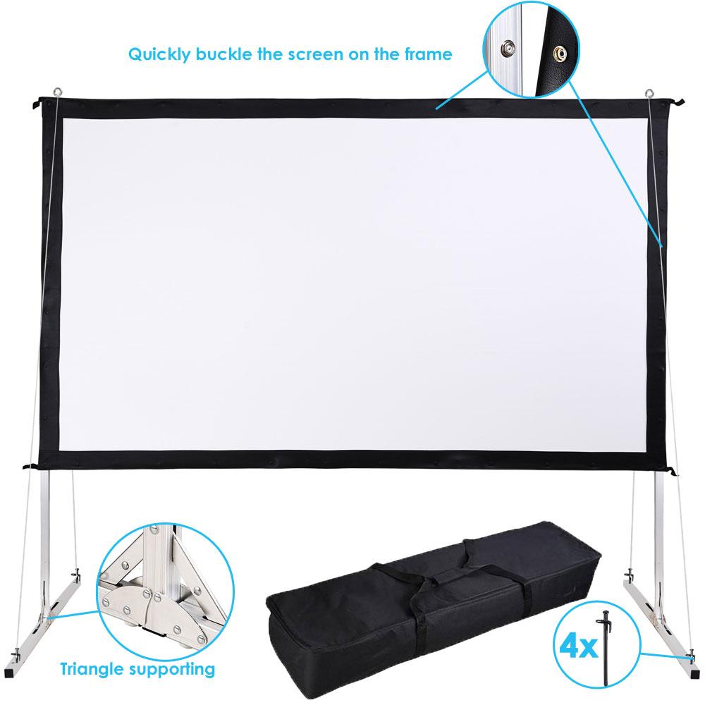 100" 16: 9 Portable Freestanding Front Projector Screen wit Aluminum Stand Legs features fast folding which is easy to set up. It comes with stakes and ropes to provide extra stability when use for outdoor. 160 degree viewing angle with front projection screen; supports HD projection.