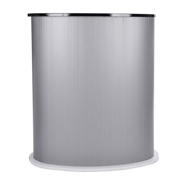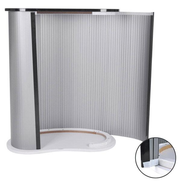 - The kidney bean shape of the exhibit podium table is designed for easy standing back