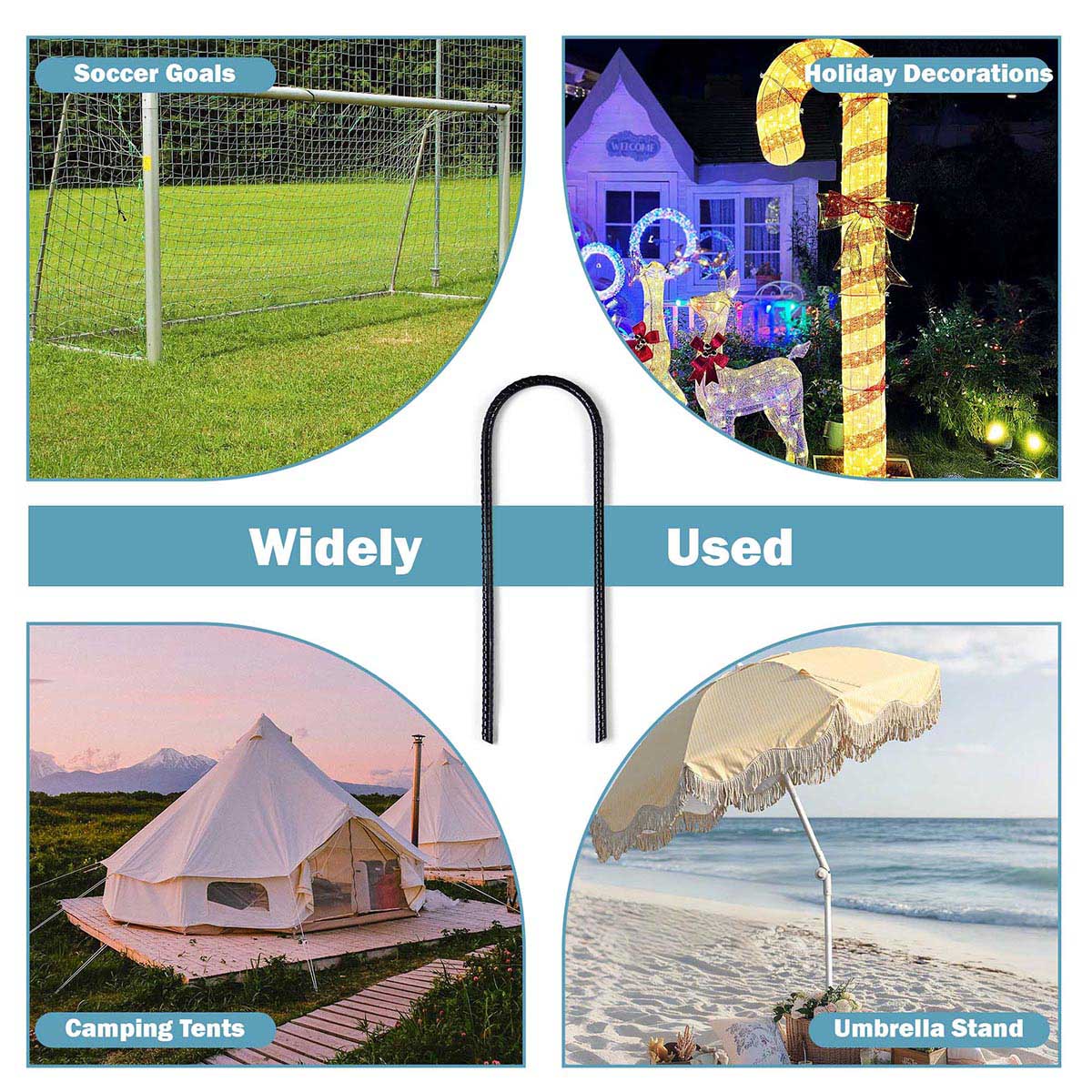 - Universal Fit - These 11" U-shaped stakes fit any trampoline tube or frame size up to 2 3/4" in diameter, securely anchoring your trampoline, soccer goal, camping tent, or umbrella stand with confidence